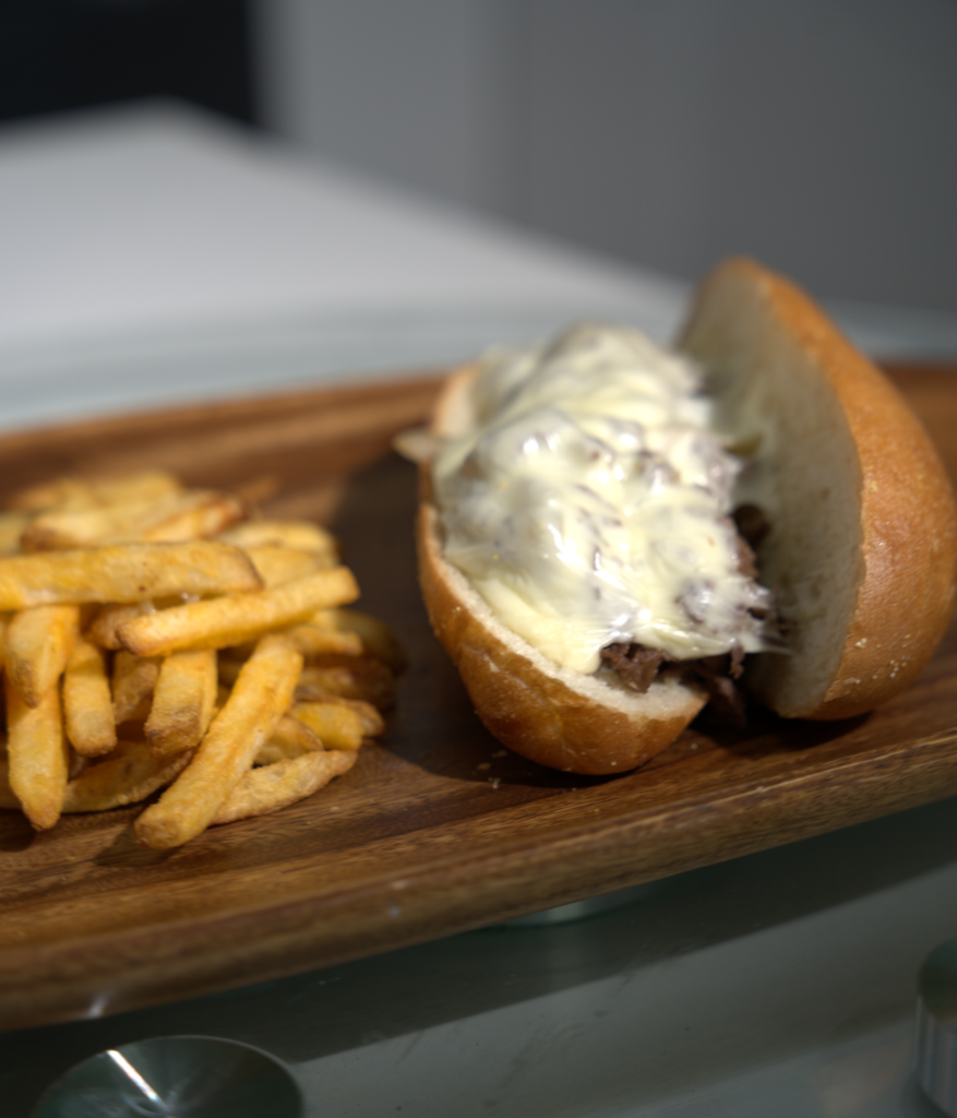 Carne de ribeye salteada con pimiento, cebolla y queso provolone.