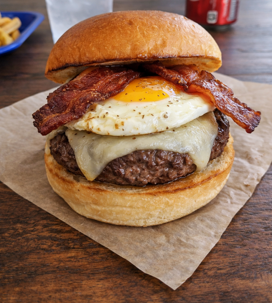 Carne 6 oz, huevo frito, queso provolone y bacon.