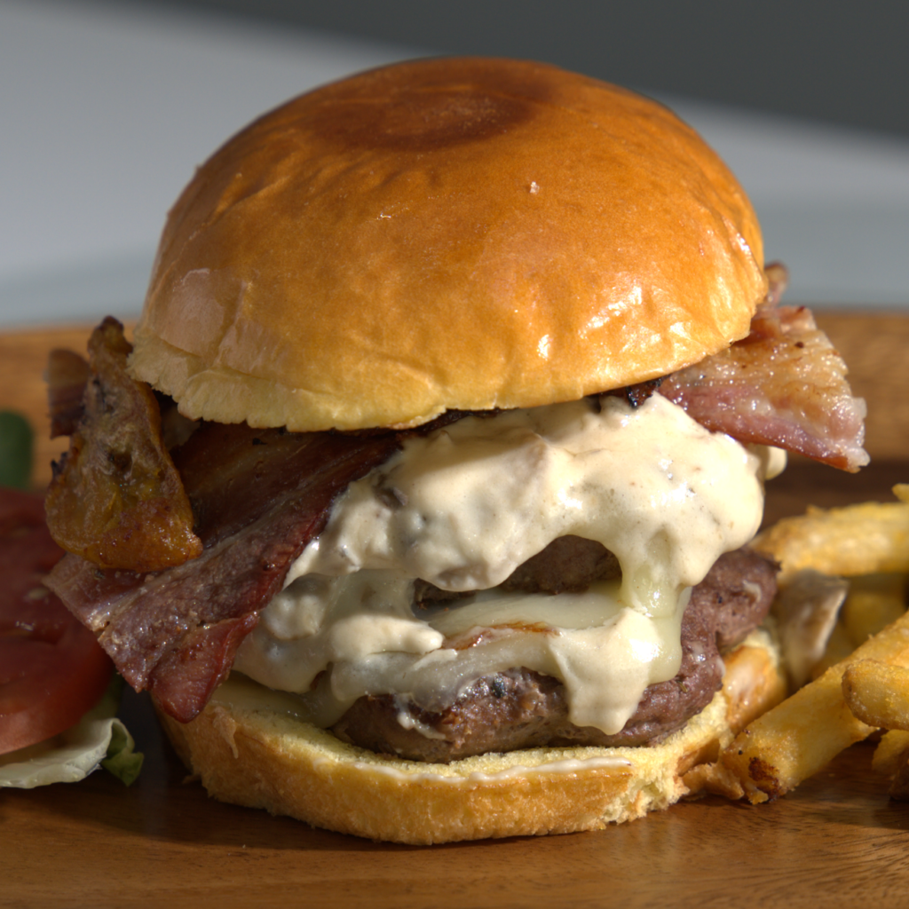 Doble carne 6 oz, salsa de champiniones, bacon y queso provolone.