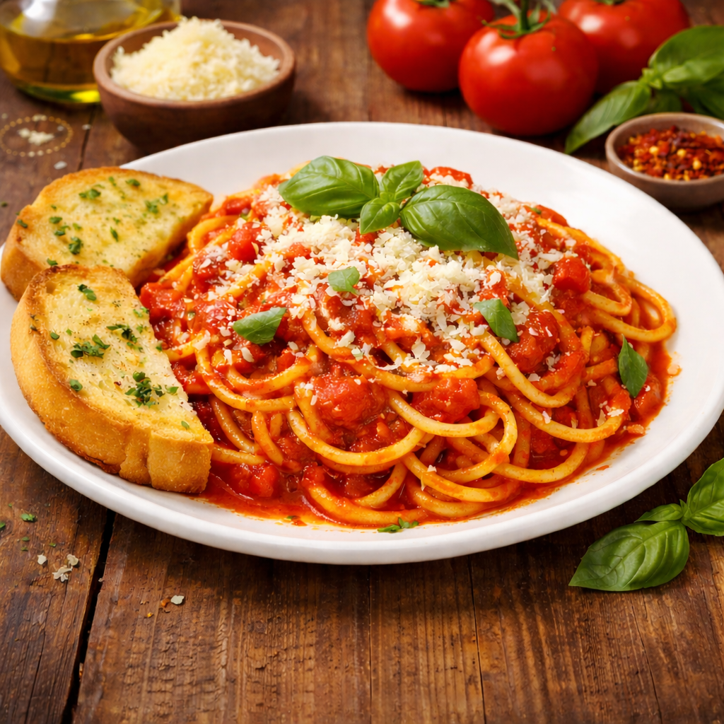 Espagueti en salsa pomodoro casera con queso parmesano y albahaca. Incluye: 2 panes de ajo